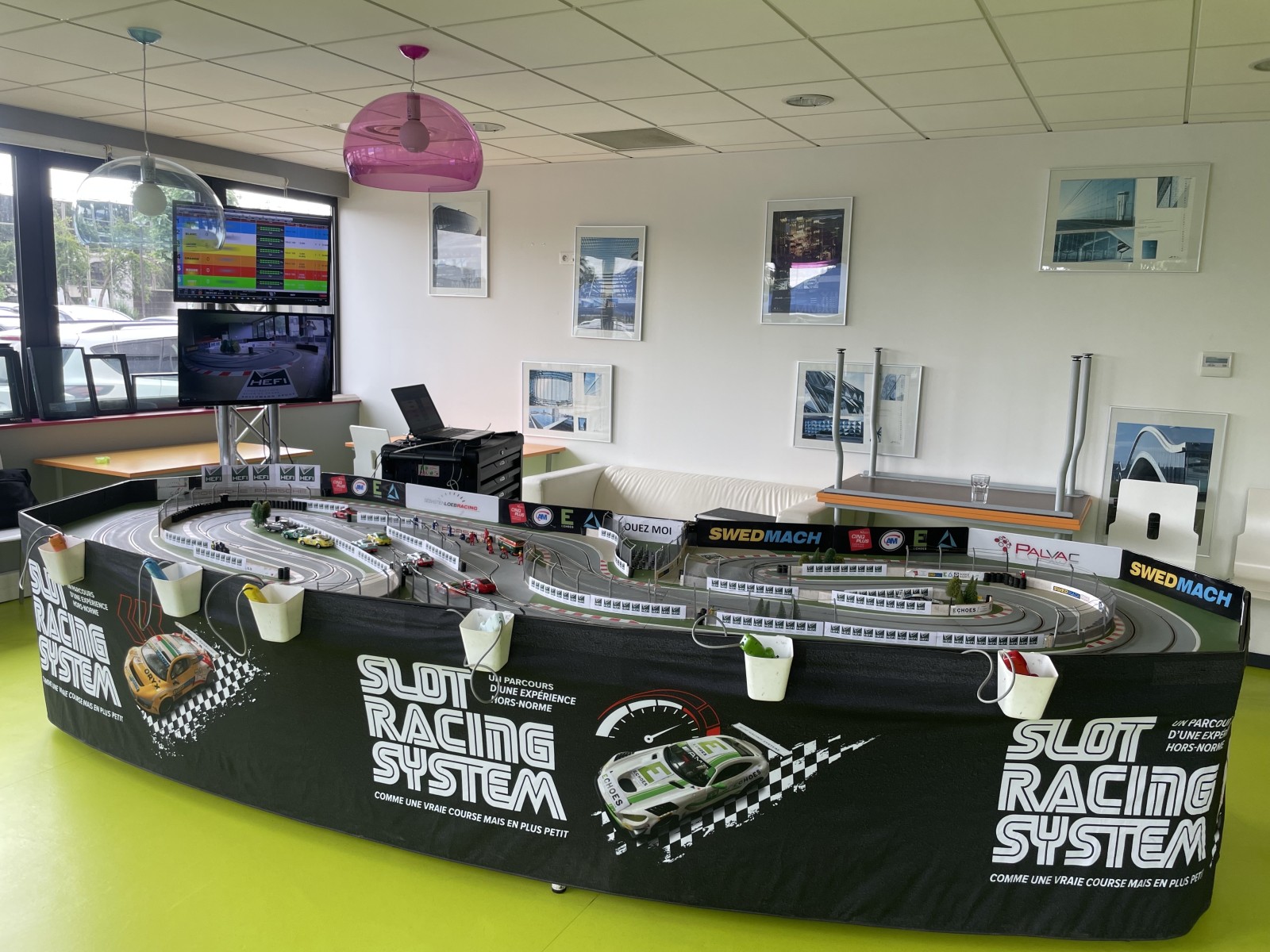 SLOT RACING SYSTEM a récemment participé à une journée dans l'entreprise HEFI à Strasbourg dans le Bas-Rhin avec animation d'un stand avec un circuit de voitures miniatures. Ces dernières avaient été personnalisées pour l'occasion avec les noms du sponsor.